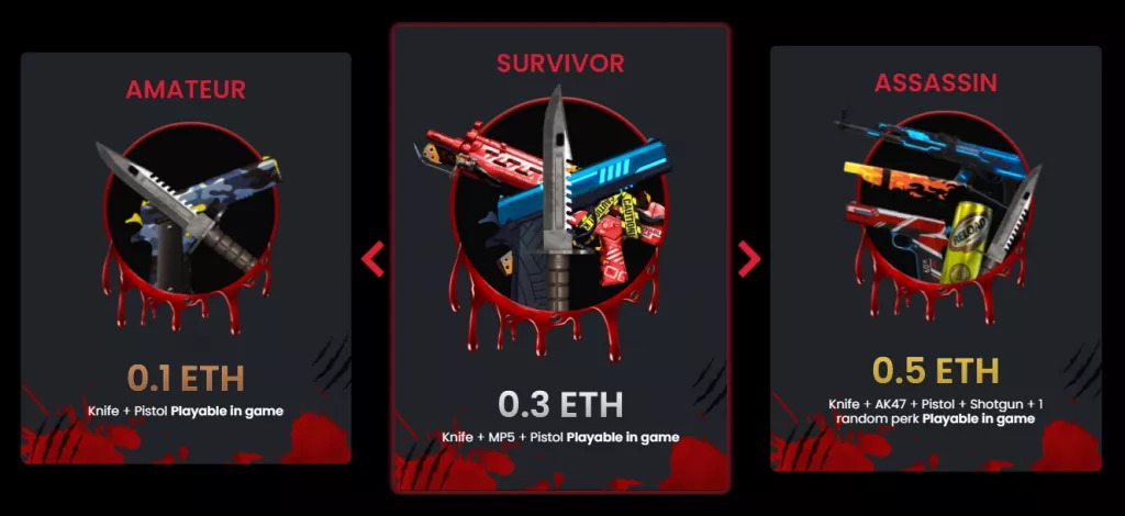 Let’s looks at the FPS blockchain game Undead Blocks. Our team created art for it, including characters and weapons. The game offers zombie killers to expand their arsenal of weapons with NFT options and even whole packages at attractive prices.